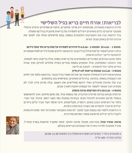 מזמינים אתכם לסדרת "לבריאות!" - סדרה קצרה של 4 מפגשים בימי רביעי בבוקר, מעשירה ומחזקת לגוף ולנפש.